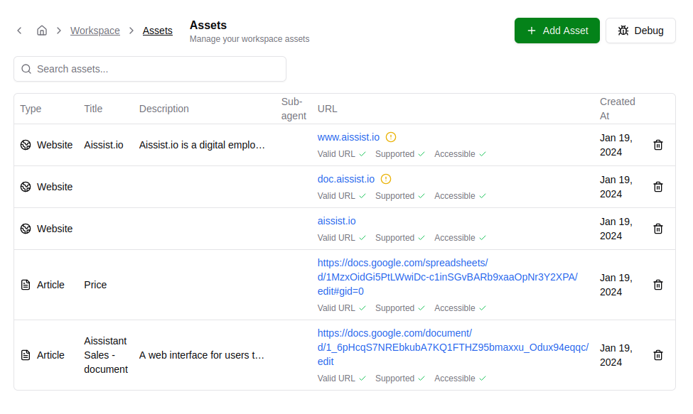 Aissist.io Assets feature - Transforming websites, knowledge bases, and documents into a trusted AI brain